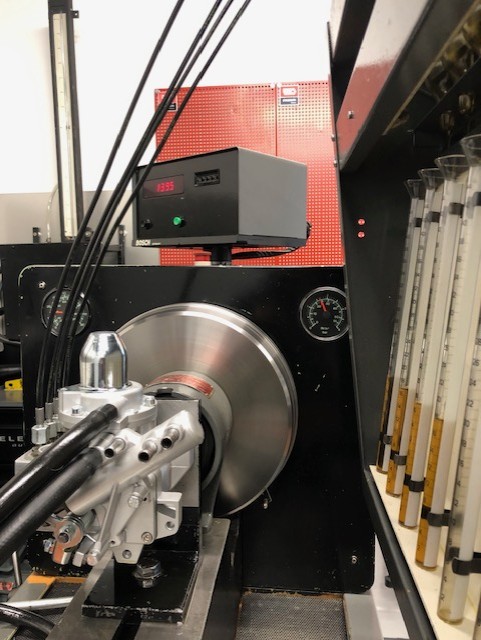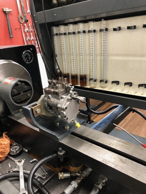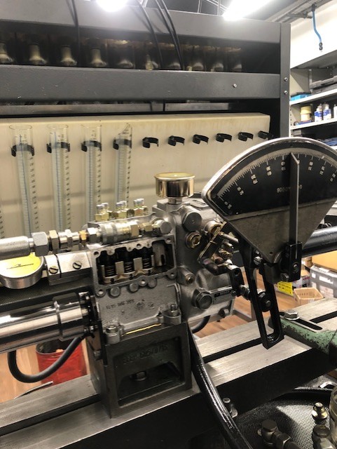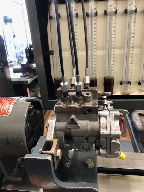 Après la réfection complète en atelier, nous procédons aux réglages et calibrations sur banc d’essai, comme celui présenté ci‑contre.